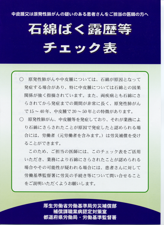 中皮腫又は原発性肺がんの疑いのある患者さんをご担当の医師の方へ 石綿ばく露歴等チェック表
